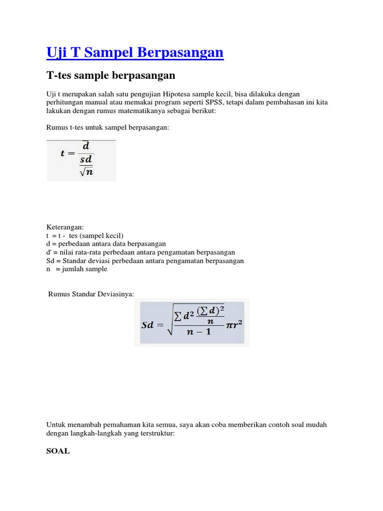 Contoh soal uji t 2 sampel berpasangan. Uji t satu sampel dan dua sampel uji t atau test t adalah salah satu test statistik yang dipergunakan untukmenguji kebenaran atau kepalsuan hipotesis nihil yang menyatakan bahwa diantara dua buah mean sampel yang diambil secara random dari populasi yang sama tidak terdapat perbedaan yang signifikansudjiono 2010278. William sealy gosset menganggap bahwa untuk sampel kecil nilai z dari distribusi normal tidak begitu cocok. Pengertian uji komparatif k sampel berpasangan. Sampel berpasangan dapat diartikan sebagai sebuah sampel dengan subjek yang sama namun mengalami 2 perlakuan atau pengukuran yang berbeda yaitu pengukuran sebelum dan sesudah dilakukan sebuah treatment. Uji ini menghitung selisih antara nilai dua variabel untuk tiap kasus dan menguji apakah selisih rata rata tersebut bernilai nol. Uji t sample berpasangan sering kali disebut sebagai paired sampel t test.
