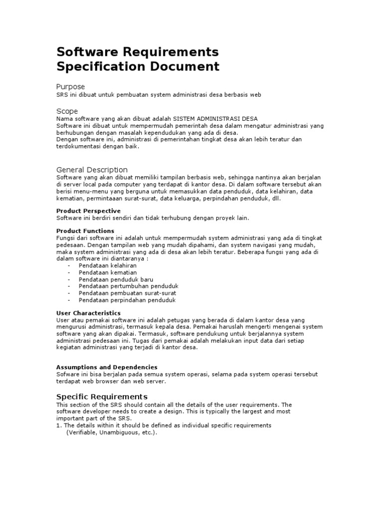 Introduction 11 purpose dokumen srs ini menjelaskan requirement untuk mengimplementasikan fitur fitur pada aplikasi cuti online. Contoh definisi criteria dan target 5. Dokumen software requirement specification srs merupakan. Contoh software requirement specification srs untuk aplikasi pelacakan barang i. Less than usd 15000. Srsdoc software requirements specification 1.
