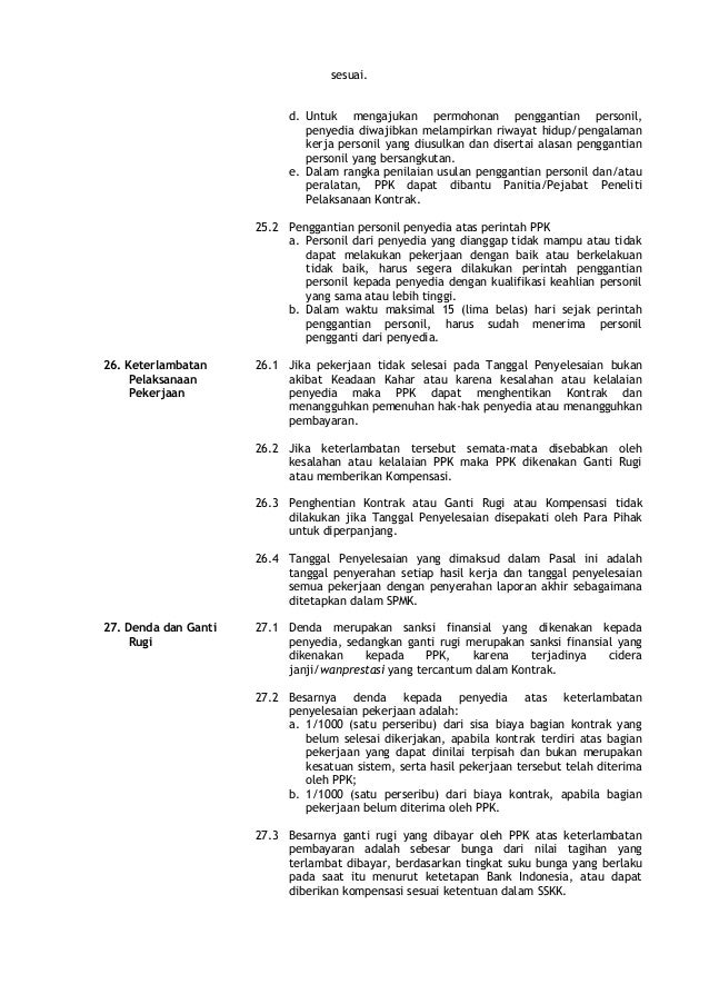 Referensi dari proyek serupa konsultan iso 17025. Format tersebut dibuat berdasarkan peraturan presiden nomor 70 tahun 2012 tentang perubahan kedua atas perpres nomor 54 tahun 2010 tentang pengadaan barangjasa pemerintah dan perka lkpp nomor 15 tahun 2012 tentang standar dokumen pengadaan. Format kontrak pekerjaan konstruksi saat ini mengacu pada peraturan menteri pupr nomor 07prtm2019 tentang standar dan pedoman pengadaan jasa konstruksi melalui penyedia. Pengadaan langsung barangpekerjaan konstruksijasa lainnya adalah metode pemilihan untuk mendapatkan penyedia barangpekerjaan konstruksijasa lainnya yang bernilai paling banyak rp20000000000 dua ratus juta rupiah. Pengadaan langsung jasa konsultansi adalah metode pemilihan untuk mendapatkan penyedia jasa konsultansi yang bernilai. Mengingat telah diterbitkannya permen pupr no.