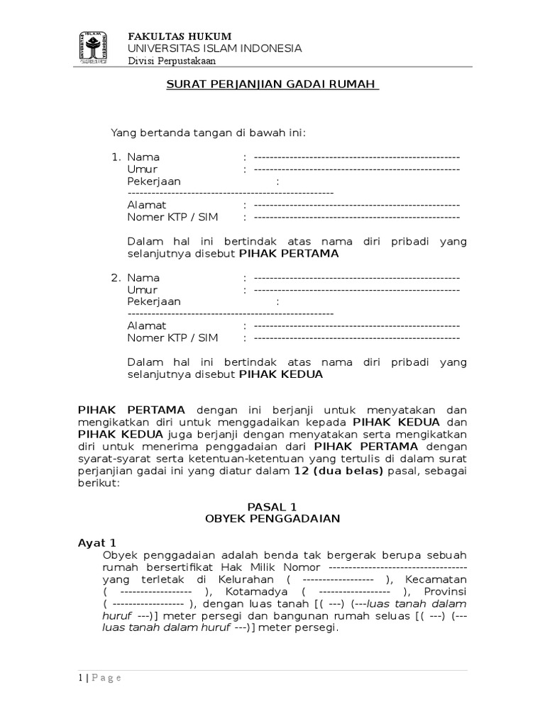 Contoh surat gadai rumah. Dengan adanya contoh surat perjanjian gadai rumah yang mengikat ini tentu lebih menguatkan kedua belah pihak tentang hak dan kewajiban masing masing. Dalam hal ini bertindak atas nama diri pribadi yang selanjutnya disebut pihak pertama. Tentu saja keduanya memiliki karakteristik pegadaian yang berbeda. Identitas pihak pertama dan pihak kedua identitas lengkap termasuk nama lengkap umur pekerjaan hingga nomor ktp oleh kedua belah pihak. Nomor ktp sim. Demikianlah berbagai contoh surat perjanjian gadaiuntuk mendapatkan contoh lain bentuk surat perjanjian yang sesuai dengan kebutuhan anda silahkan lihat contoh surat perjanjian kami yang lain dalam kategori surat perjanjian.