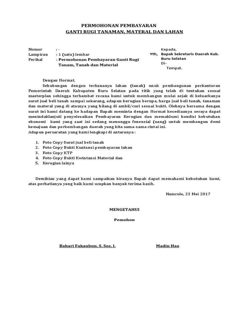 Contoh surat ganti rugi tanah. Selain contoh ganti rugi yang berhubungan dengan sewa rumah dan kecelakaan surat pernyataan bersedia membayar ganti rugi dibawah ini bisa dimodifikasi untuk mengganti kerugian yang diakibatkan misalnya. Seperti pembangunan jalan tol pasar dan gedung pemerintahan. Maka sejak surat ini ditanda tangani lepaslah hak milik pihak pertama i dan resmi menjadi hak milik pihak kedua ii misni dan tanah tersebut tidak dalam sengketa atau diagunkan kepada pihak bank sesuai surat ganti rugi yang pertama tanggal 06 januari 1998 dari saudara pardi sitorusapabila ada gugatan atau masalah dikemudian hari atas tanah tersebut maka segala yang timbul ditanggung. Pada artikel sebelumnya kita telah membahas mengenai surat perjanjian jual beli rumah sederhanapada artikel contoh surat perjanjian jual beli tanah terbaru kali ini kita akan membahas mengenai topik yang hampir sama. Mohon maaf apabila terdapat kesamaan namatempatinformasi lain karena surat yang dibuat hanya bertujuan sebagai percontohan tanpa ada maksud apapun. Shietra partners mensinyalir besaran ganti rugi tidak berupa surat keputusan ataupun dalam bentuk penetapan pejabat daerahdisinilah celah hukum bagi oknum aparatur bermain dan memancing di air keruh.