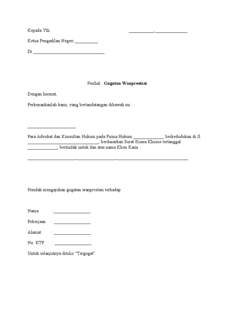 Contoh surat gugatan wanprestasi untuk awam gugatan wanprestasi diajukan karena adanya pelanggaran kontrak dari salah satu pihak. Contoh surat gugatan perdata tentang sengketa jual beli hak dan gugatan wanprestasi surat gugatan perdata merupakan sebuah surat yang berisikan tentang tuntutan atas hak hak yang dimiliki oleh pihak penggugat dan terbukti hak hal tersebut telah diambil oleh pihak tergugat. Penggugat dengan ini hendak mengajukan gugatan wanprestasi terhadap. Semoga bermanfaat untuk anda yang sedang menyusun format surat jawaban gugatan. Hadi ferdiansyah beralamat di. Contoh surat gugatan wanprestasi.