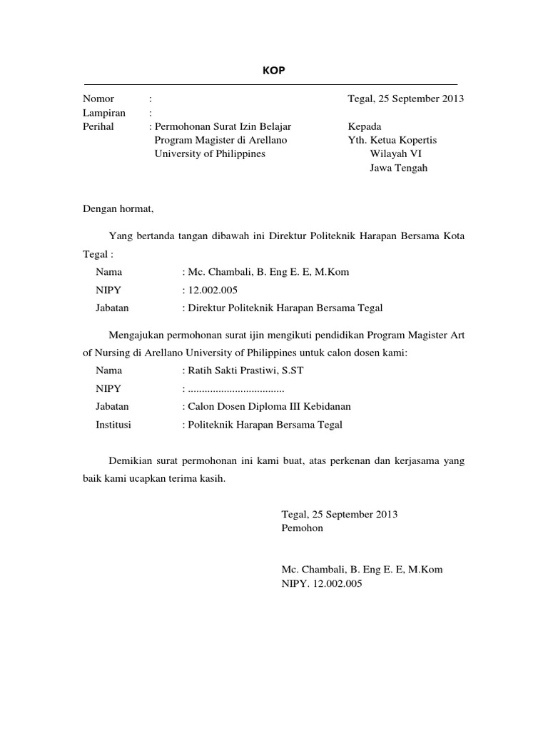 Contoh surat keterangan pemberian izin melanjutkan studi atau kuliah dosen berikut ini adalah sebuah contoh surat tentang surat pemberian izin kepada salah satu dosen untuk melanjutkan kegiatan studi s2.
