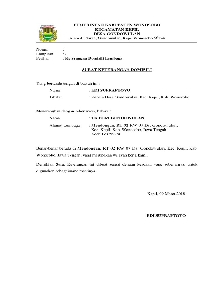 Surat keterangan domisili lembaga. Surat ini biasanya diterbitkan oleh aparat atau pejabat tertentu namun tujuannya dipergunakan oleh seseorang untuk suatu kegiatan ataupun kepentingan pribadi. Surat ini biasanya digunakan dalam administrasi kependudukan maupun dalam dunia kerja. Itulah contoh surat keterangan domisili lembaga dari desa yang dapat admin kumpulkan. Namun keterangan tertulis mengenai domisili bukan hanya ditujukan untuk orang saja namun juga untuk badan usaha. Peraturan desa tentang perubahan anggaran pendapatan dan belanja desa kalibuaya tahun anggaran 2015.