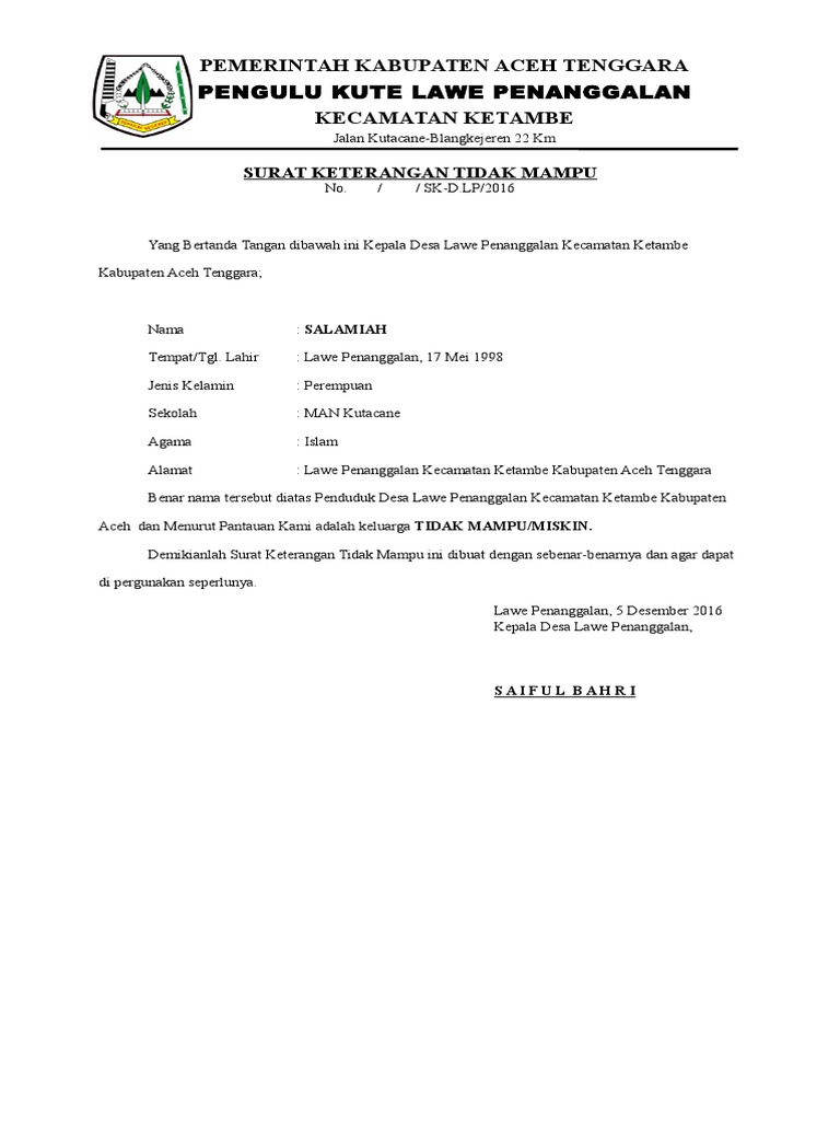 Contoh surat keterangan tidak mampu dari desa. Contoh surat keterangan tidak mampu bagi siswa yang tidak mendapatkan kpspip hanya diperuntukan bagi siswa yang benar benar tidak mampu. Dengan menggunakan surat keterangan tidak mampu ini maka seseorang telah memiliki bukti resmi dari pihak berwenang bahwa orang yang bersangkutan memang benar sedang dalam keadaan kurang mampu dan membutuhkan bantuan. Demikian beberapa contoh surat keterangan tidak mampu yang dapat saya cantumkan dalam artikel kali ini. Tidak setiap orang dapat menerima surat keterangan tidak mampu ini orang yang. Surat keterangan tidak mampu ialah sebuah surat yang dibuat dan dikeluarkan dari pihak yang berwenang ketua rt ketua rw kepala dusun kelurahan kepala desa sekolah dan lainnya untuk dapat menerangkan bahwa warganya yang telah disebutkan dalam surat tersebut merupakan salah satu warga yang tidak mampu yang berdomisili di daerah tertentu. Demikian surat keterangan tidak mampu ini di buat untuk dapat dipergunakan dengan seperlunya.