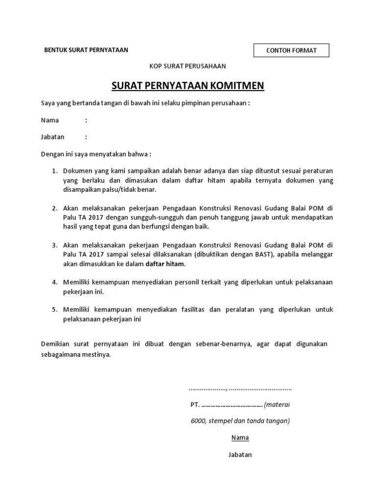 Contoh surat komitmen kerja. Untuk lebih jelas sebaiknya perhatikan contoh surat pernyataan dari beberapa fungsi. Surat perjanjian kerja paruh waktu. Dalam bentuknya jika disebutkan secara lisan pernyataan sulit untuk dapat dibuktikan kecuali bila ada saksi. Contoh komitmen kerja karyawan adalah sebagai berikut. Jika kita sudah berkomitmen dalam sebuah pekerjaan maka kita akan merasa nyaman dan semangat saat bekerja. Kondisi yang dimaksud mencakup kesanggupan terhadap segala sesuatu yang tertuang dalam surat tersebut antara lain sanggup bekerja lembur bersedia mengabdi beberapa tahun bersedia ditempatkan diluar kota sanggup tidak.