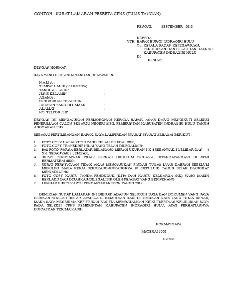 Ayo di download contoh surat lamaran pernyataan cpns 2018juga contoh dokumen persyaratan dan pengumuman alokasi formasi cpns 2018. Bila kamu ingin mengundurakan diri dari tempat kerja kamu sekarang lalu ingin pindah ke perkerjaan lain dan membutuhkan contoh. Contoh surat lamaran cpns 2019 resmi untuk guru bumn dan pemda. Contoh surat lamaran kerja doc word sudah banyak yang share di internet namun masih sangat sedikit yang menggunakan format yang baik dan benar.