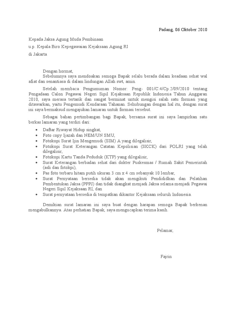 Contoh surat lamaran kerja cpns kejaksaan. Sebagai bahan pertimbangan bersama ini saya lampirkan.