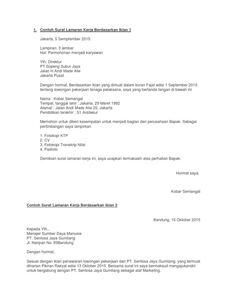 Contoh lain surat lamaran kerja berdasarkan iklan. Nah bagi yang melamar pekerjaan karena mendapatkan informasi dari iklan bisa mencantumkan dari iklan mana informasi tersebut didapat. Surat lamaran yang lengkap dan benar dapat menjadi salah satu pertimbangan sebuah perusahaan untuk menerima orang tersebut. Bagian personalia po box 002 jakarta 10001 hal. Contoh surat lamaran kerja berdasarkan iklan lowongan kerja di koran merupakan salah satu jenis dari surat lamaran hanya pada contoh ini lebih dispesifikasikan bahwa sumber informasi lowongan kerja yang kita dapat adalah dari koran atau harian.