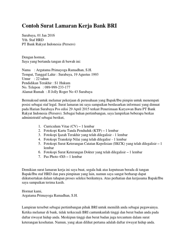 Namun sebelum itu pada postingan sebelumnya admin sudah membagikan contoh surat lamaran kerja di bank bri. Contoh surat lamaran kerja di bank banyak sekali masyarakat yang minat bekerja di bank. Jalan godean 12 sleman yogyakarta pendidikan terakhir. S1 akuntansi telepon. Contoh surat lamaran kerja di bank bekerja di bank mungkin bagi sebagian orang merupakan salah satu impian. Contoh surat lamaran kerja di bank bni yang terhormat hrd bni cabang yogyakarta kota jalan mataram 123 yogyakarta dengan hormat saya yang bertanda tangan di bawah ini nama lengkap.