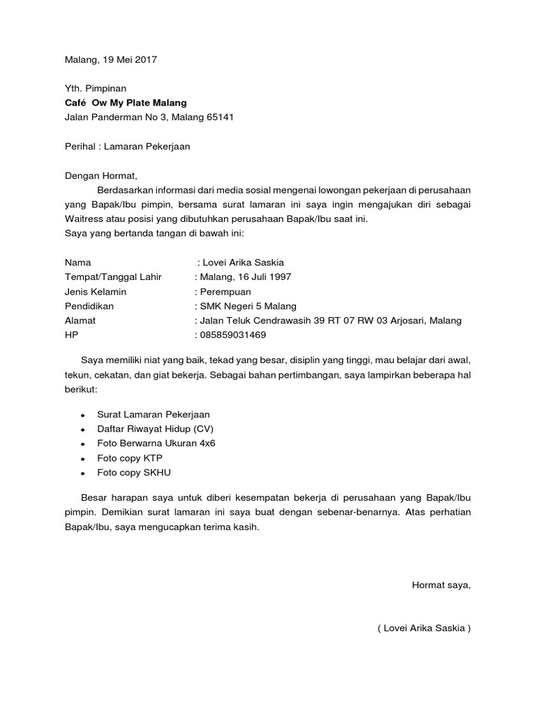 Contoh surat lamaran kerja dalam bahasa inggris posisi waitress setiap rumah makan restoran ataupun cafe cafe tentu membutuhkan waitress untuk melayani para tamu dan pembeli. Contoh surat lamaran kerja waiter dan waitress bagi anda seorang calon pekerja yang sekarang ini sedang sibuk mencari lapangan pekerjaan dan kebetulan ingin mencoba melamar di bidang kuliner seperti menjadi pelayan atau waiter waiters di restoran dan kafe tentu harus paham betul mengenai hal hal yang berkaitan agar diterima di tempat yang anda lamar sebagai tempat kerja salah satu yang. Contoh surat lamaran kerja ini dibuat tentu saja untuk menjadi referensi bagi anda yang sedang mencari panduan untuk membuat surat lamaran kerja. Jadi untuk menulis surat lamaran kerja di cafe harus jelas posisi apa yang dilamar apa saja yang dilampirkan dan biodata singkat dari pelamar. Untuk itu saya tertarik dengan lowongan tersebut dan hendak mengajukan diri untuk melamar di café boysin. 15 contoh surat lamaran kerja cafe yang baik dan benar membuat surat lamaran kerja di cafe pada dasarnya sama saja dengan surat lamaran kerja lainnya.