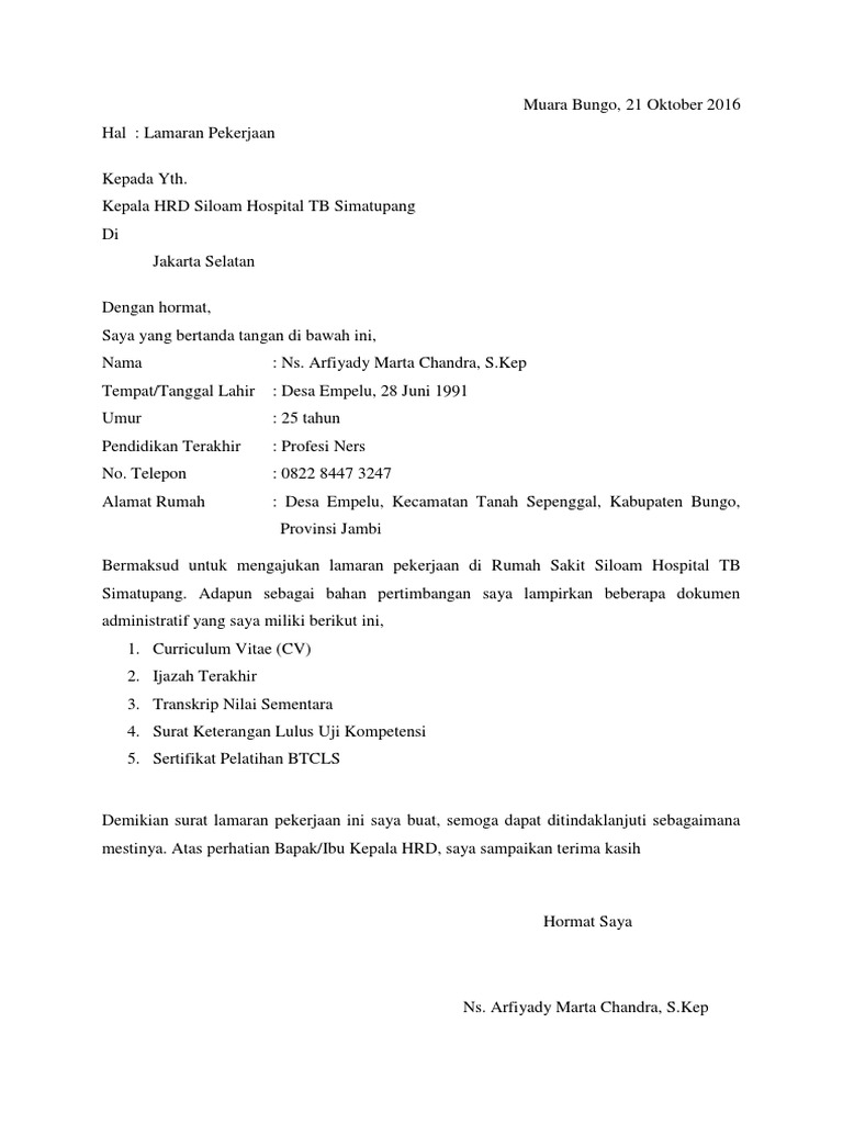 Contoh surat lamaran kerja di rumah sakit cukup dengan memperhatikan beberapa hal di atas maka surat lamaran kerja yang anda ajukan mudah mudahan akan mendapat perhatian dari hrd rumah sakit. Cv wajib pas foto ktp. Baik itu jurusan keperawatan jurusan kebidanan sampai dengan jurusan kedokteran. Contoh surat lamaran kerja di rumah sakit adalah merupakan postingan yang akan saya bahas pada kesempatan yang berbahagia ini untuk kamu para pengunjung setia semuanya khususnya bagi kamu yang ingin melamar pekerjaan di rumah sakit tentunya akan membutuhkan referensi dalam membuat surat lamaran kerja di rumah sakit maka tetaplah berada di halaman ini karena disini saya akan memberikan. Untuk lebih jelasnya bagaimana format surat lamaran kerja yang baik dan benar silahkan lihat pada beberapa contoh yang sudah saya siapkan di bawah.