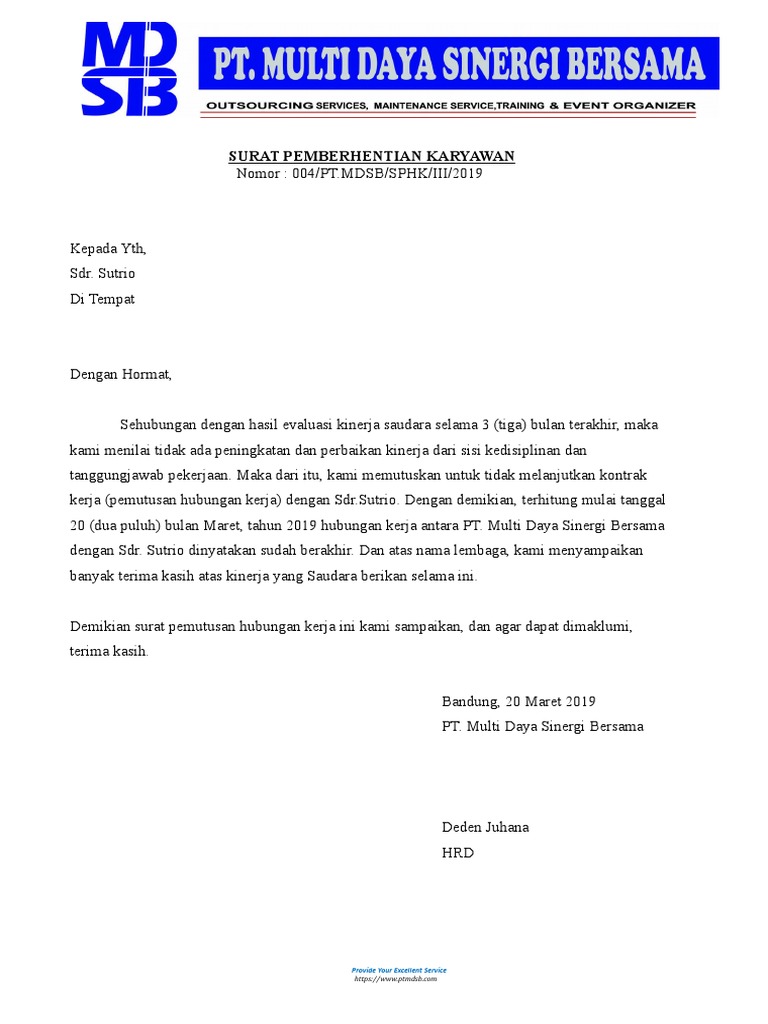 Download contoh surat pemberhentian kerja dengan terhormat. Tentu saja karyawan yang sudah bekerja dengan baik dan menunjukkan loyalitas pada perusahaan tentunya tidak mengharapkan mendapat surat pemutusan hubungan kerja. Pemecatan atau pemutusan kerja tersebut disebabkan oleh karyawan atau karena perusahaan sudah tidak membutuhkan karyawan tersebut untuk bekerja di perusahaan mereka. Surat pemutusan hubungan kerja ini merupakan surat yang dikeluarkan oleh perusahaan atau instansi kepada seorang karyawannya yang bertujuan untuk mengakhiri kerja sama antara pihak perusahaan atau instansi dengan orang yang. Contoh surat phk bagi para karyawan tentu tak asing mendengar surat pemutusan hubungan kerja phk. Contoh surat pemberhentian kerja pemutusan hubungan kerja phk diberikan kepada karyawan karena berbagai alasan.