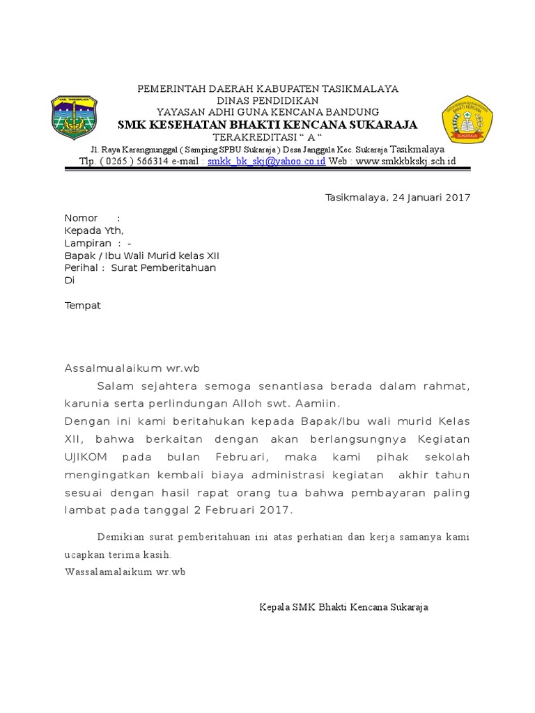 Demikian surat ini pemberitahuan ini kami buat atas pemakluman dan kerja samanya diucapkan terima kasih. Isi surat pemberitahuan sekolah ini sangat beragam salah satunya perihal pembayaran sekolah. Surat pemberitahuan pembayaran administrasi sekolah kop sekolah 16 januari 2015. Biasanya pihak sekolah akan membuat surat edaran terkait pembayaran biaya study tour. Berikut contoh surat izin kegiatan pramuka kop surat nomor. Kegiatan study tour selalu menjadi agenda yang ditunggu tunggu bagi siswa sekolah.