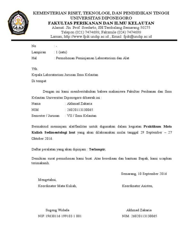 Teknik lingkungan universitas diponegoro di semarang. Sebelum menulis tentang contoh surat permohonan izi peminjaman sarana prasana sekolah saya ucapkan selamat tahun baru 2017. Kami mengharapkan bantuan dan kerjasamanya. Contoh surat permohonan peminjaman dan pemakaian laboratorium semarang tglblnthn hal. Setiap mahasiswa yang melakukan peminjaman alat harus tercatat dan menyerahkan kartu mahasiswa sebagai jaminan. Home contoh surat contoh surat peminjaman alat laboratorium contoh surat peminjaman alat laboratorium.
