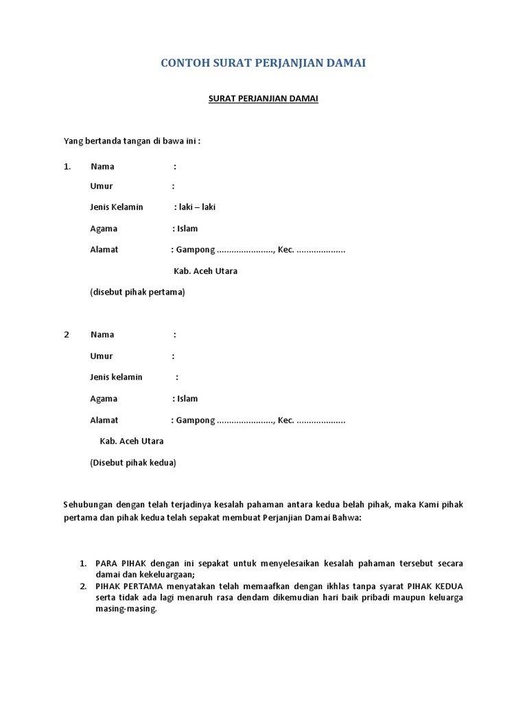 Contoh surat perjanjian damai. Download contoh surat pernyataan damai secara kekeluargaan yang dapat diunduh secara lengkap dan gratis tanpa perlu daftar. Kumpulan contoh contoh surat lamaran kerja kontrak jual beli perjanjian kerjasama dan sebagainya. Surat perjanjian ini meliputi banyak hal dan bidang dan juga sering dipergunakan oleh banyak pihak. Contoh surat pernyataan secara umum surat pernyataan merupakan jenis surat yang dibuat oleh individu yang menyatakan dirinya atau dibuat untuk orang lain yang pernah atau tidak pernah melakukan sesuatu. 15 contoh surat perjanjian yang baik dan benar paling lengkap ketika dua orang atau dua pihak melakukan sebuah kesepakatan maka perlu adanya surat perjanjian yang jelas mengenai kesepakatan yang dibuat tersebut. Contoh surat perjanjian damai kecelakaan lalu lintas jalan raya saat berkendara di jalan raya baiknya kita harus berhati hati agar selamat sampai tujuan.