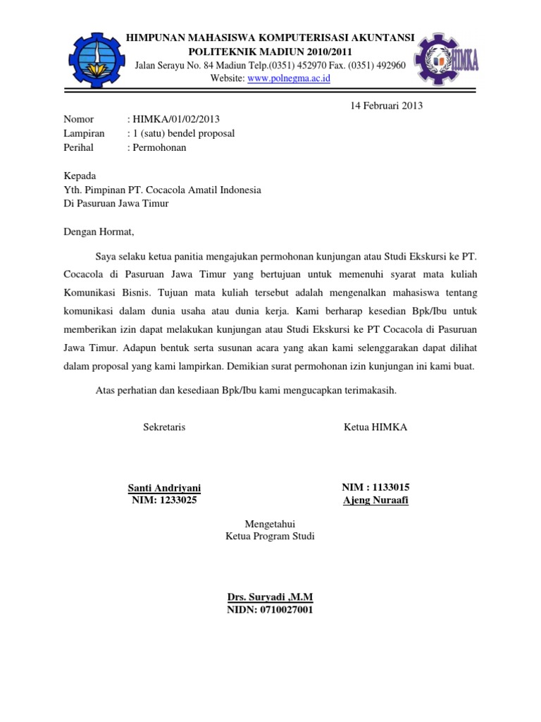 Ada beberapa aspek penting yang harus diperhatikan yaitu. Sumedang 04 desember 2013 mengetahui kepala sekolah ketua panitia achmad syukur s. Surat permohonan kunjungan industri adalah surat yang dibuat oleh suatu lembagainstansi resmi untuk mengajukan permohonan izin melakukan kunjungan kepada pelaku industri lain dalam rangka pembelajaran. Surat izin kunjungan industri pt phapros semarang. Contoh surat permohonan kunjungan. Surat keluar dan surat masuk adalah pekerjaan yang biasa kita lakukan selaku staff tata usaha pada kesempatan kali ini admin akan mencoba membagikan contoh surat keluar yaitu surat permohonan kunjungan.