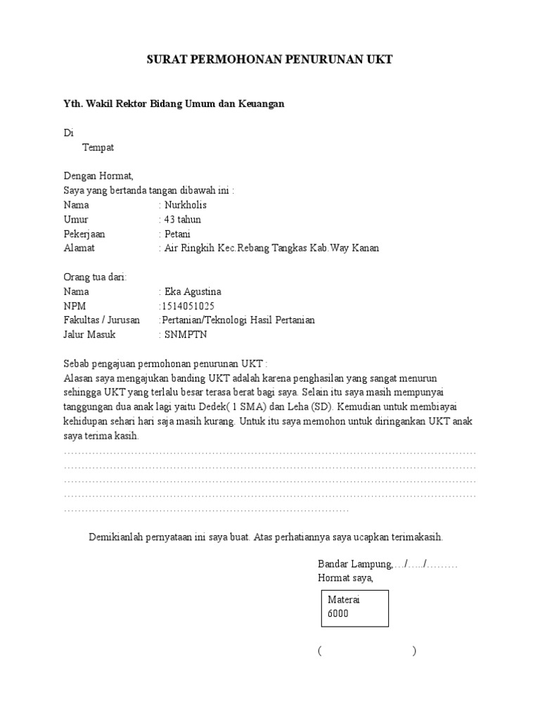 Air ringkih kecrebang tangkas kabway kanan orang tua dari. Surat permohonan banding ukt. Dengan hormat saya yang bertanda tangan dibawah ini. Bermaksud untuk mengajukan diri supaya dapat dipertimbangkan sebagai penerima keringanan ukt kategori i. 43 tahun pekerjaan. Surat keterangan tidak mampu sktm dari kelurahan 3.
