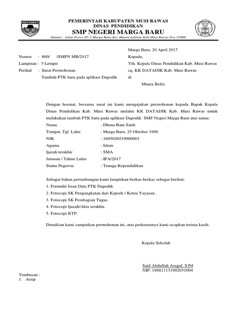 Contoh format surat permohonan penambahan ptk baru aplikasi dapodik arsip operator dapodik bagi bapakibu operator sekolah yang ingin melakukan penambahan ptk baru dalam aplikasi dapodik terbaru v2016 harus membuat surat permohonan usulan melalui kk datadik kabupatenkota. Semoga bermanfaat bagi kita semua. File format surat permohonan tambah ptk baru aplikasi dapodik pada link di atas yang bisa anda download ini disimpan di cloud storage google drive untuk menjamin keamanan file dari virus atau malware file otomastis melewati proses scan anti virus oleh sistem google drive. 2 responses to contoh surat permohonan penambahan ptk baru pada aplikasi dapodik sdn 010091 kisaran baru 20 februari 2017 1731 terima kasih sudah membagikan artikel ini sangat bermanfaat sekali. Download contoh format surat pengantar permohonan ptk baru di aplikasi dapodik 20162017 silahkan klik di sini. Surat permohonan tambah ptk baru pada dapodik 2018 aplikasi dapodik versi 2018 didukung banyak fitur berbeda dengan aplikasi versi sebelumnya.
