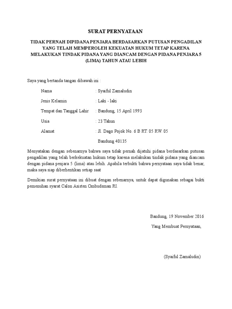 Surat pernyataan tidak sedang menjalani hukuman pidana penjara surat pernyataan tidak pernah dijatuhi pidana penjara berdasarkan putusan pengadilan surat pernyataan tidak pernah melakukan tindak pidana contoh surat pernyataan tidak pernah dihukum penjara untuk cpns surat keterangan tidak pernah terlibat dalam kasus hukum yang di tandatangani di atas materai 6000 surat pernyataan tidak. 15 contoh surat pernyataan paling lengkap untuk berbagai kebutuhan belakangan ini penggunaan surat memang bisa dibilang sudah semakin minim terlebih untuk urusan pribadi. Pada posting ini saya akan sharing sebuah contoh surat pernyataan tidak pernah dijatuhi hukuman pidana penjara berdasarkan putusan pengadilan yang telah mempunyai kekuatan hukum tetap. Ada contoh surat pernyataan perjanjian contoh surat pernyataan kesalahan contoh surat pernyataan diri contoh surat pernyataan kerja contoh surat pernyataan sekolah contoh surat pernyataan hutang contoh. Untuk contoh surat tersebut akan saya tulis pada postingan selanjutnya. Tulis nomor induk kependudukan sesuai ktp alamat.