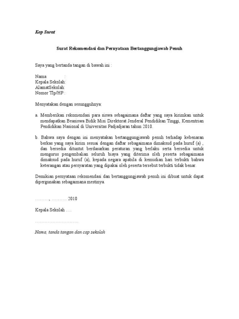 Contoh surat rekomendasi beasiswa dari kepala sekolah. Contoh surat rekomendasi sebagai makhluk sosial kita perlu berkomunikasi dengan orang lain untuk memenuhi berbagai kebutuhan dan keinginan. Fakta ini biasanya diisi dengan data sesuai permintaan dari orang yang meminta surat rekomendasi tersebut. Salah satu contoh paling kecil adalah surat rekomendasi dari kepala desalurah ataupun dari kepala sekolah. Contoh surat rekomendasi sekolah untuk beasiswa dan melanjutkan sekolah contoh surat rekomendasi sekolah merupakan sebuah surat yang dibuat oleh pimpinan yang mana di dalam surat tersebut berisi atau menjelaskan tentang keadaan dari yang bersangkutan berdasarkan data data otentik yang bisa dipertanggung jawabkan. Salah satu dari sekian banyak jenis surat berdasarkan kepentingan tersebut adalah surat yang bertujuan untuk merekomendasikan seseorang agar melakukan sesuatu. Semoga contoh ini dapat bermanfaat bagi anda yang membutuhkannya.