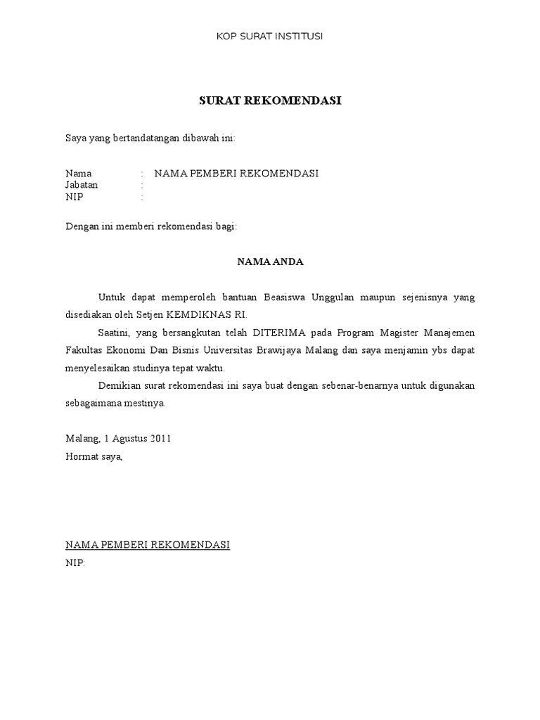 Contoh surat rekomendasi beasiswa unggulan. Contoh surat rekomendasi beasiswa surat rekomendasi menjadi salah satu syarat yang selalu ada dalam setiap beasiswakamu dapat meminta surat rekomendasi ini kepada dosen atau atasan tempat kamu bekerja. Surat rekomendasi beasiswa unggulan dikti by swahyuningsih86 in types school work farid mawardi. Dinyatakan sebagai peserta beasiswa unggulan berdasarkan surat keputusan kepala biro perencanaan dan kerjasama luar negeri. Contoh surat rekomendasi beasiswa pendidikan merupakan salah satu aspek yang sangat penting dalam kehidupan seseorang. 15 contoh surat rekomendasi yang baik dan paling lengkap jika diartikan secara sederhana maka surat rekomendasi bisa diartikan sebagai surat yang dibuat oleh seorang pimpinan atau pejabat tertentu yang berisi keterangan tentang seseorang berdasarkan fakta fakta yang ada. Pada saat minta surat rekomendasi jangan lupa melampirkan cv kamu biar pemberi rekomendasi bisa menilai.