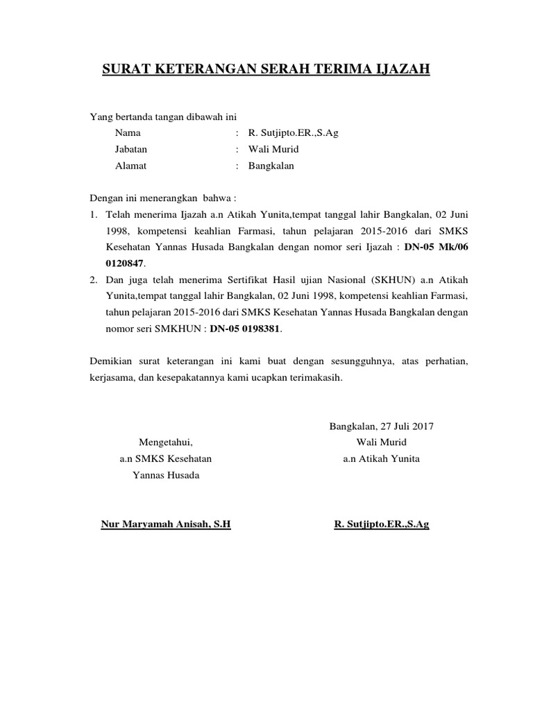 Contoh surat tanda terima ijazah dari perusahaan. Kali ini saya akan share tentang bagaimana sih membuat surat penahanan ijazah di perusahaan awalnya saya bingung untuk membuat draft nya dan alhamdulilah ada pak bos yang membimbing dan akhirnya jadilah surat tanda terima penahanan ijazahnya. 15 contoh surat tanda terima uang barang dan dokumen berbagai contoh dan jenis surat tentu tidak bisa terlepas dari berbagai kegiatan perusahaan instansi pemerintahan organisasi lembaga dan berbagai kelompok lainnya. Seseorang yang saat ini sedang bekerja di dunia usaha khususnya yang sudah sering melakukan pengiriman barang tentu penting baginya untuk memahami seperti apa surat tanda terima barang karena nanti yang bersangkutan harus membuat surat tersebut sebagai bukti bahwasanya barang yang dikirim sudah resmi telah diterima oleh tujuan. Semoga dengan penjelasan tadi membuat anda lebih paham lagi tentang surat tanda terima. Walaupun anda menamatkan pendidikan sarjana namun jika tidak memegang ijazah maka. Contoh surat balasan verifikasi ijazah.