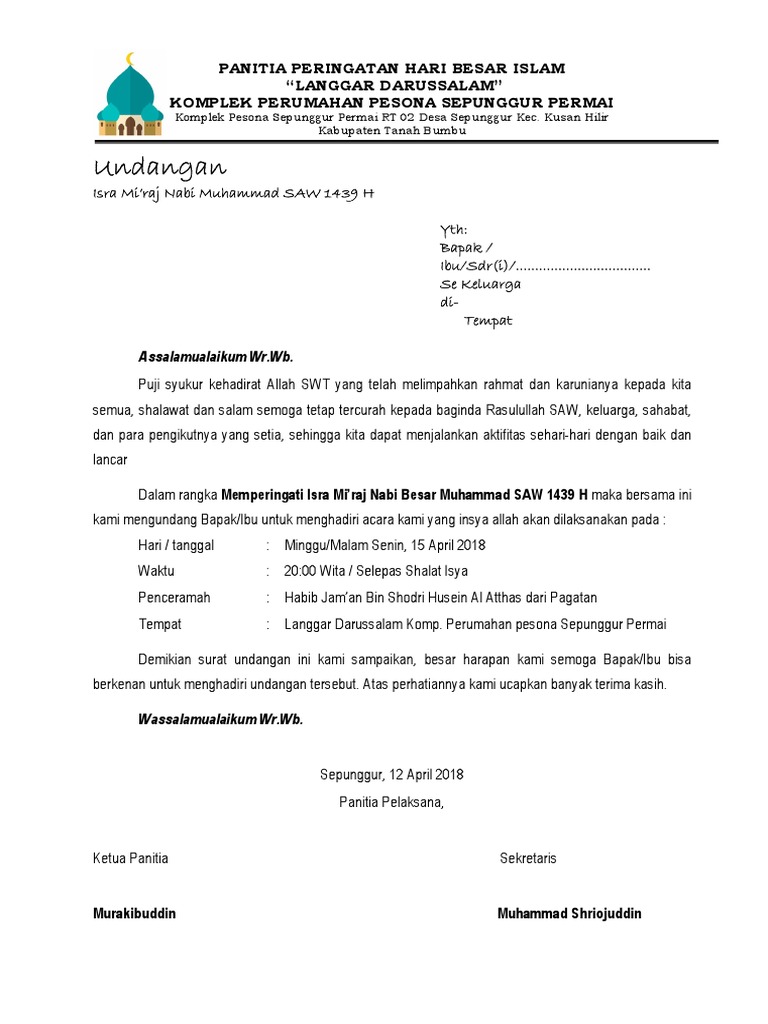 Contoh surat undangan isra miraj pada setiap tanggal 27 rajab kalender hijriah. Baik kali ini ane mau memberikan contoh surat undangan peringatan hari besar islam yaitu isra miraj nabi besar muhammad saw. Contoh surat undangan isra miraj panitia peringatan isra miraj nabi muhammad saw. Ra kosasih kpngaweng rt 0204 dessukaraja kabsukabumi no. Atas perhatiannya kami ucapkan banyak terima kasih. 373284036 sk pengurus masjid al mttaqin pd baru docx.
