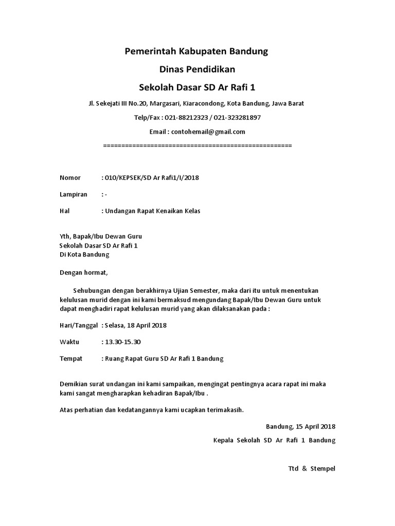 Nama sekolah dan kelapa sekolah yang digunakan pada contoh surat ini hanya fiktif belaka. Contoh surat undangan rapat rapat adalah unsur penting dalam sebuah organisasi lembaga instansi komunitas dan semacamnya. Isi dari surat tersebut hanyalah sebuah contoh saja jadi mohon maaf apabila ada kesalahan dalam menuliskan data dari pada sekolah tersebut. Surat undangan rapat komite sekolah dibuat oleh staf tata usaha sekolah tu. Berikut contoh surat undangan rapat komite. Contoh surat undangan rapat rapat adalah suatu kegiatan semacam diskusi yang dilakukan oleh suatu organisasi susunan kepanitiaan atau perusahaan tertentu yang tujuannya adalah membahas tentang suatu masalah mengevaluasi atau mendiskusikan tentang suatu kegiatan tertentu yang akan dilaksanakan oleh kelompok kelompok tersebut.