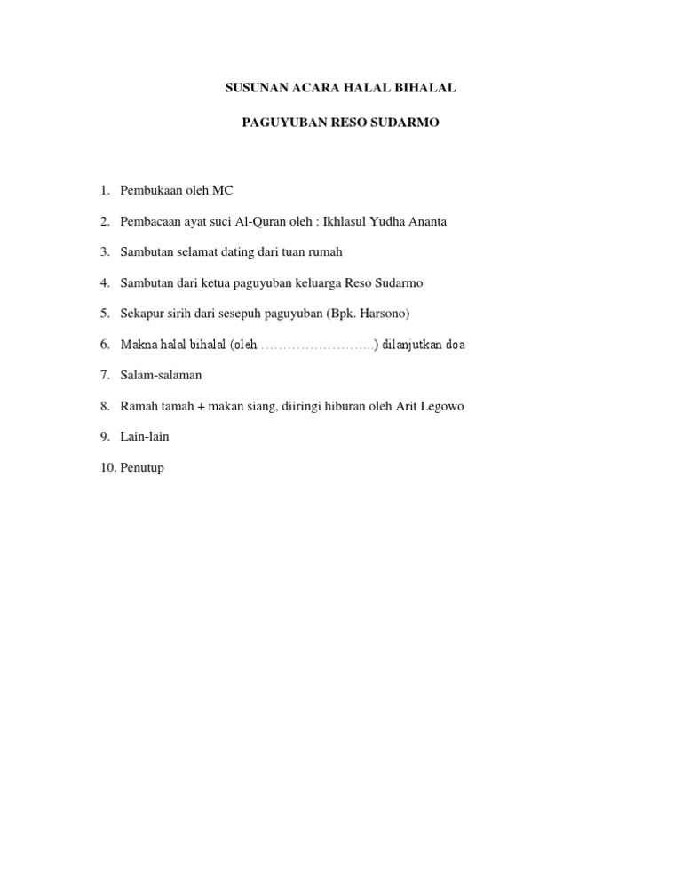 Contoh susunan acara halal bihalal. Haris setiawan selaku pembina takmir masjid al hurriyah yang kami hormati alumni takmir masjid al hurriyah serta sahabat sahabati semua yang saya. Allahuma laa sahlan ilamajaaltahu sahlan waanta tajalul huzna insyitasahlan yang terhormat kepada. Pembacaan ayat suci al quran beserta saritilawah yang akan dibawakan oleh bp k saefudin dan mb susi prasetyo. Contoh susunan acara halal bi halal. Contoh teks pembawa acara halal bihalal di bawah ini saya tulis contah teks pembawa acara sebagai panduan untuk sdrai menjlnkan tugas sebagai mcpembawa acara pada halal bihalal yang akan datang bismillahirahmanirahiim. Selamat datang kami ucapkan di blog kami.