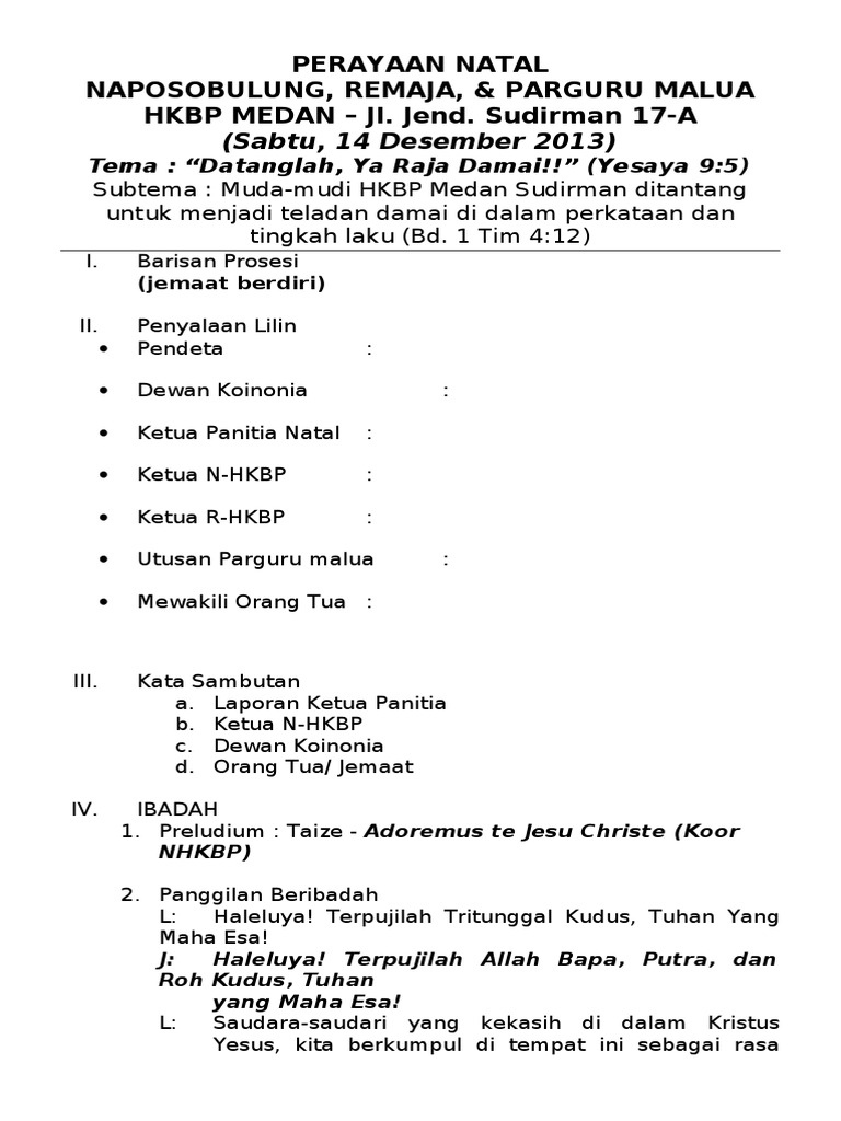 Contoh tata ibadah perayaan natal jemaat gereja protestan di indonesia bagian barat g p i b majelis jemaat immanuel di medan sumut. Dalam perayaan natal tahun ini dilakukan serangkaian acara mulai dari kunjungan kasih ke panti asuhan pemberian bantuan kepada korban bencana alam dan yang terakhir perayaan natal pada hari ini. Itu adalah contoh susunan panitia natal 2017 yang dibentuk belum lama ini. Halaman 3 berisi susunan prosesi ibadah. Susunan acara ibadah perayaan natal congregational theater center youth of kgpm ucapan selamat datang doa pembukaan pembacaan puisi pementasan teater 1 adam hawa nabi nabi pemasang lilin pelayanan firman. Susunan perayaan ibadah natal 25 desember tema.