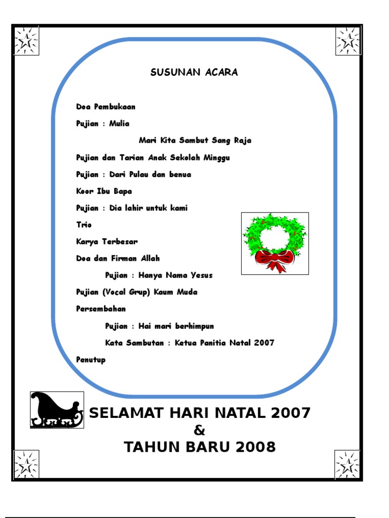 Lewat pementasan teater 2 patung rantai persembahan pementasan teater. Natal kristus yesus. Jika diperlukan anda juga bisa menambahkan halaman terakhir pada buku liturgi natal yang berisi ucapan selamat kepada jemaat. Karena pentingnya susunan acara dalam ibadah kesempatan kali ini akan diberikan contoh susunan cara natal. Kiranya susunan acara ini dapat menjadi contoh bagi kita semua. Susunan acara kebaktian perayaan natal gereja bethel injil sepenuh efrata ramunia kecamatan beringin 24 desember tahun 2012.