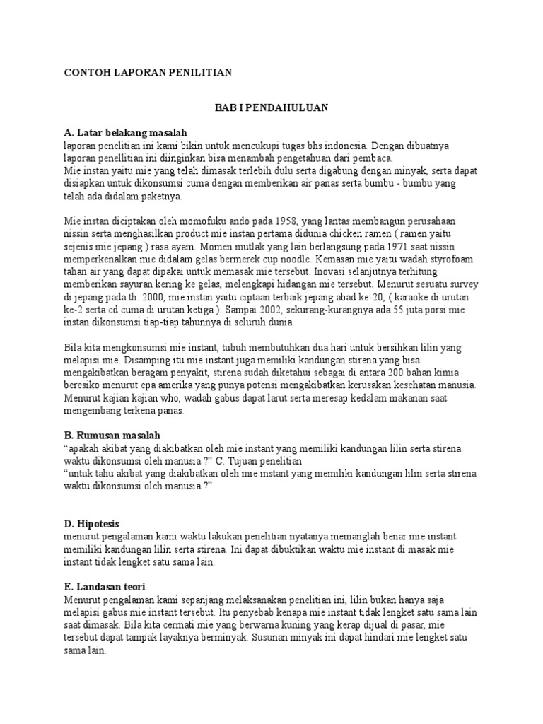 Laporan penelitian merupakan tahap akhir dari proses penelitian dimana peneliti menyampaikan dan mengkomunikasikan kepada audiens hasil akhir risetnya melalui tulisan. Contoh susunan tata cara pembuatan laporan hasil praktikum tanah 2012. Sistematika penulisan laporan penelitian secara umum sama namun sebagian lembaga instansi membuat ketentuan tersendiri hal ini dilakukan untuk menyeragamkan hasil laporan penelitian oleh mahasiswa atau si peneliti. Contoh proposal penelitianpembahasan pada artikel kali ini blog ekonomi akan melanjutkan artikel sebelumnya yaitu contoh proposal yang akan kami mulai dengan contoh proposal penelitianseperti kita ketahui sebelumnya ada banyak jenis penelitian berdasarkan metode penelitian antara lain penelitian historis penelitian perkembangan penelitian deskriptif penelitian kasuslapangan penelitian. Pertama laporan harus ditulis dalam bahasa yang mudah dipahami oleh publik ketika membacanya. Contoh susunan laporan penelitian.