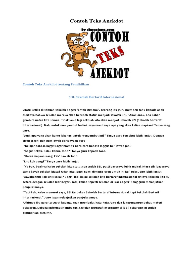 Anekdot adalah jenis teks yang menceritakan cerita yang lucu namun sarat akan sindiran. Kalian beruntung menemukan artikel ini karna materibindo akan membahas contoh teks anekdot tentang pendidikan beserta struktur teksnya. Pendidikan adalah senjata paling ampuh karena dengann pendidikan mampu mengubah dunia. Contoh teks anekdot singkat apa sih pengertian teks anekdot. Makanya teks anekdot yang sering dibuat selalu seputaran layanan publik bidang sosial hukum lingkungan dan politik. Contoh anekdot bahasa indonesia sebelum saya memberikan contoh anekdot tentang pendidikan dan lucu kita bahas tentang pengertian anekdotseperti informasi yang saya dapat dari wikipedia dijelaskan anekdot adalah cerita singkat dan lucu atau menarik yang mungkin menggambarkan kejadian atau hal yang sebenarnya anekdot bisa saja sesingkat pengaturan dan provokasi dari sebuah kelakar karena.