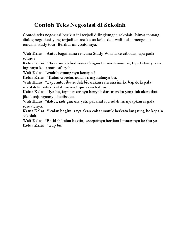 Negosiasi antara wali kelas dengan ketua kelas berkaitan dengan rencana study wisata. Contoh teks negosiasi dalam bentuk narasi jual beli di sekolah pemecahan konflik larangan formal untuk 2 orang 3 orang 4 orang 5 orang. Posting pada bahasa indonesia sma umum ditag bahasa yang digunakan dalam teks negosiasi berikut yang merupakan contoh negosiasi yaitu biasanya negosiasi dilakukan dengan cara menyampaikan pengajuan dan penawaran ciri kebahasaan teks negosiasi contoh dialog negosiasi 20 percakapan contoh dialog negosiasi rencana study tour contoh kalimat penawaran contoh negosiasi dalam bisnis contoh. Selain itu ada juga pembahasan tentang pengertian fungsi dan tujuan ciri ciri kaidah kebahasaan dan macam macam jenis teks negosiasi. Istilah tersebut bermakna perundingan. Karena tas yang ia miliki sudah rusak.