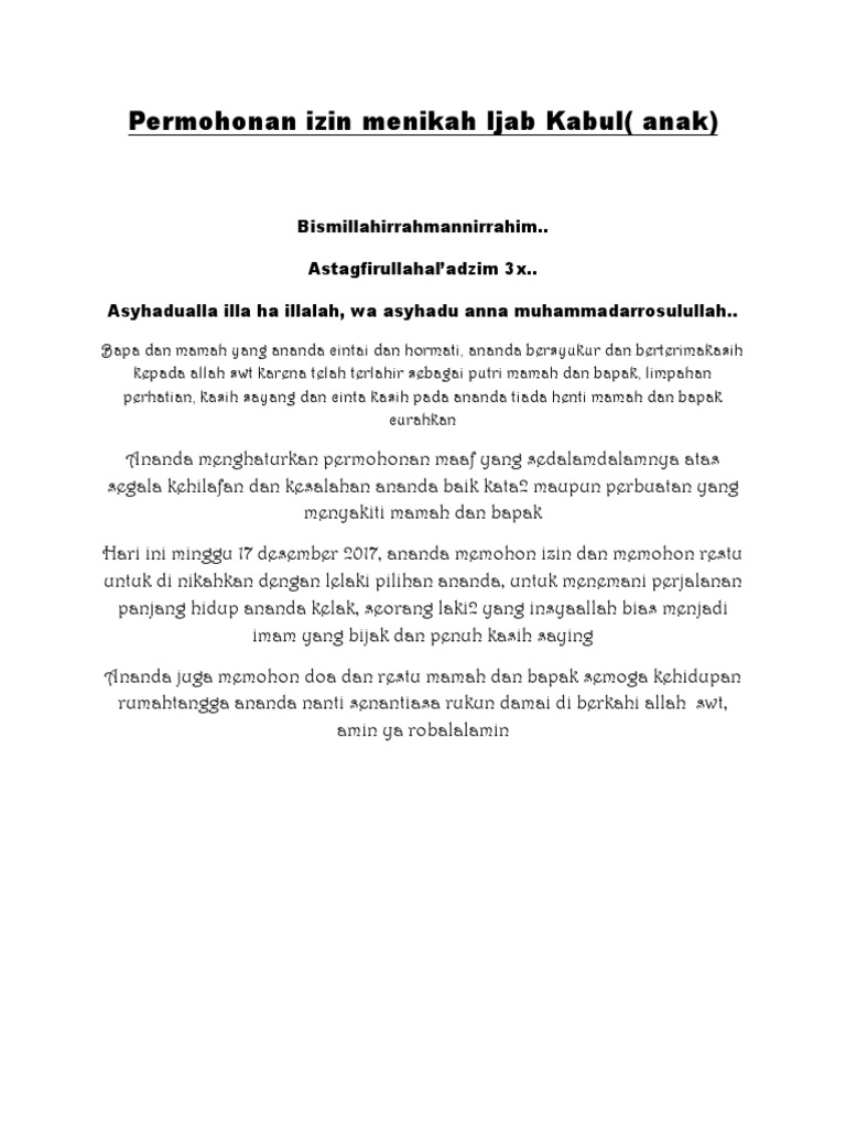Contoh teks izin menikah kepada orang tua. Permintaan doa restu dari calon pengantin kepada kedua orang tua. Prosesi inilah yang sering membuat anak dan orang tua menangis haru. Doa dan permintaan izin kepada orang tua sebelum m. Walaupun kenyataannya sudah tersedia berbagai komunikasi canggih dan modern tetapi penggunaan surat tetap saja tidak dapat ditinggalkan. Bismillahirrahmaannirrahiim astaghfirullahaladzim asyhadualla illa ha illallah wa asyhadu anna muhammadarrosulullah. Sehingga berbagai contoh surat izin orang tua akan anda butuhkan untuk memenuhi persyaratan persyaratan keperluan tersebut.