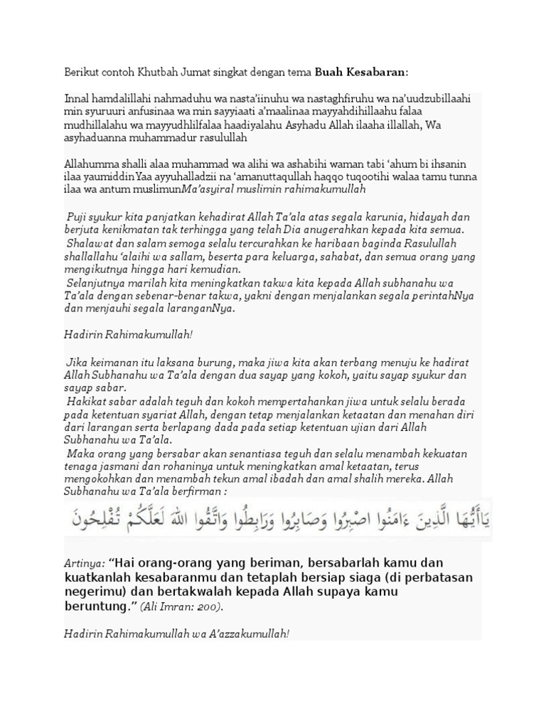 Materi contoh khutbah jumat singkat terbaru 2018 dengan judul menjadi pribadi yang bermanfaat. Dimana ibadah ini harus dilakukan pada setiap minggu di hari dan waktu yang sama. Contoh teks khutbah jumat singkat selamat malam semua di postingan ini saya akan memberikan contoh teks khutbah jumat paling singkatlangsung saja yaa g usah basa basi. Contoh khutbah jumat singkat lengkap terbaru 2020 pilihan menyentuh hati contoh khutbah jumat singkat padat terbaru tentang pentingnya ikhlas dalam beramal alhamdulillah pada kesempatan ini kami masih bisa berbagi dan menulis sebuah khutbah tentang ikhlas mudah mudahan bisa membantu sobat semua yang sedang mencarinya untuk di jadikan sebuah referensi. Berikut contoh teks khutbah jumat nya. Ketika menjalankan ibadah jumat pasti terdapat khutbah yang memiliki berbagai tema pada setiap pekannya.