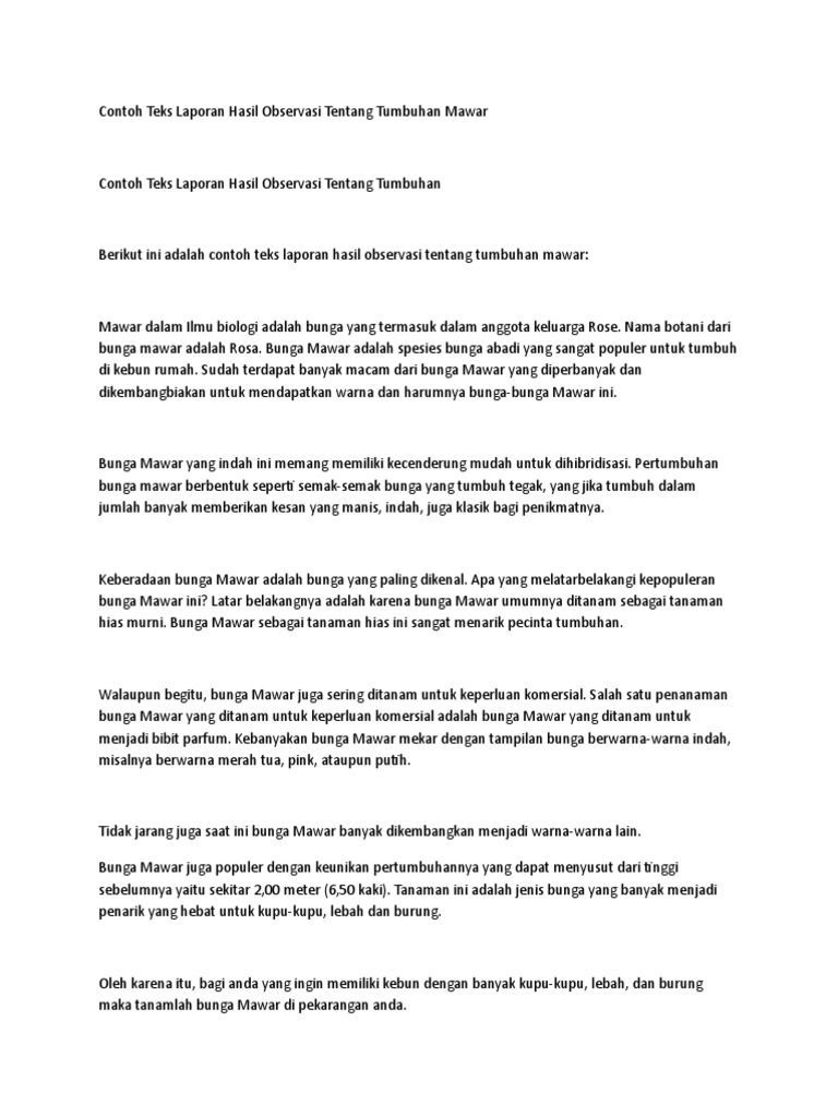 Berikut informasi sepenuhnya tentang teks laporan hasil observasi bunga mawar. Pengamatan observasi pengamatan. Dosenpendidikancom observasi adalah salah satu teknik dalam teknik pengumpulan data yang digunakan dalam suatu penelitian tertentu. Kita akan coba mengulas contoh teks laporan hasil observasi bunga mawar lengkap dengan strukturnya untuk membantu tugas kamu yang belum selesai. Contoh teks laporan hasil observasi tentang tumbuhan mawar. Contoh seni rupa murni.