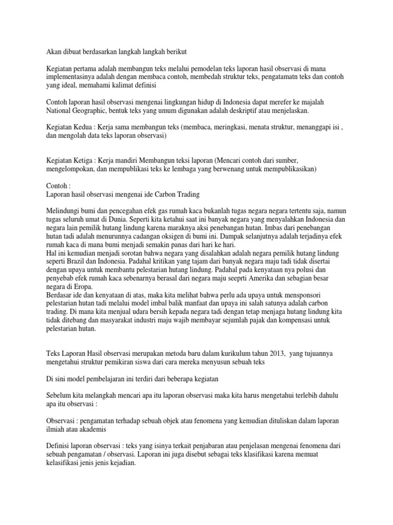 Contoh teks laporan hasil observasi tentang lingkungan hidup. Ciri lainnya adalah informasi yang dimuat dalam teks laporan hasil observasi berdasarkan fakta. Contoh teks laporan hasil observasi tahukah kalian observasi merupakan sebuah penelitian yang salah satu teknik dalam pengumpulan datanya digunakan dalam suatu penelitian tertentu. Contoh teks lho laporan hasil observasi tentang lingkungan hidup teks laporan hasil observasi merupakan teks yang dibuat ditulis dari hasil observasi di lapangan. Definisi umum deskripsi bagian dan deskripsi manfaat. Sedangkan untuk teks hasil observasi memiliki pengertian yaitu isi teks yang menjelaskan tentang sesuatu informasi baik itu informasi tentang hewan tanaman fenomena alam hasil karya manusia dan fenomena sosial yang sesuai. Dosenpendidikancom observasi adalah salah satu teknik dalam teknik pengumpulan data yang digunakan dalam suatu penelitian tertentu.