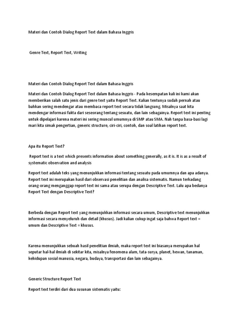 Report text adalah satu jenis tulisan yang bertujuan untuk menyampaikan informasi kepada pembaca mengenai hasil penelitian sesuatu. 20 contoh report text singkat tentang binatang dan artinya. Arti dari teks pendek bahasa inggris diatas bisa seperti berikut. 13 jenis teks dalam bahasa inggris beserta contoh dan struktur materi tentang jenis teks bahasa inggris yang biasa digunakan dalam sebuah karya tulis dengan grammar dan contoh lengkap. Report text merupakan salah satu dari 13 jenis tulisan dalam bahasa inggrisstruktur dari report text adalah general classification klasifikasi umum dan description deskripsi. Teks report adalah teks yang memberi informasi tentang sesuatu sebagai hasil dari penelitian.
