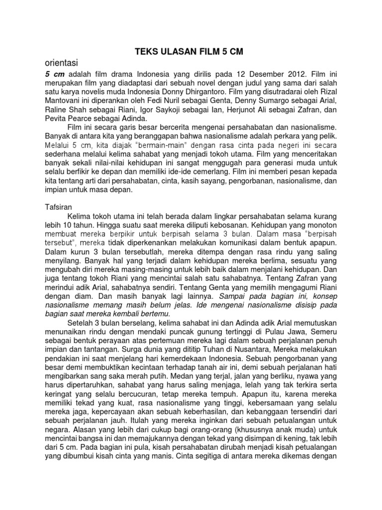 Kecil dalam novel sangat detail disebutkan jalan cerita tetapi pada film ada beberapa bagian yang dikurangi seperti contoh dalam ending cerita di novel sangat detail kerika genta dan citra menikah dan pernikahan dinda dengan deniek tidak ditayangkan. Mei 25 2016. Contoh teks ulasan film 5 cm. Film yang disutradarai oleh rizal mantovani ini diperankan oleh fedi nuril sebagai genta denny sumargo sebagai arial raline shah sebagai. Adapun laporan teks ulasan tentang film yang berjudul 5 cm ini telah kami usahakan semaksimal mungkin dan tentunya dengan bantuan dari banyak pihak sehingga dapat memperlancar proses pembuatan laporan ini. Sekian dan terima kasih.