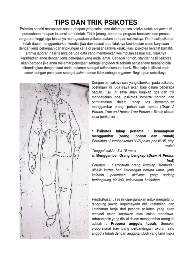 Like subscribe bantu share ya. Psikotes tahap pertama. Kemudian dibalik kertas beri keterangan berupa umur jenis kelamin pekerjaan aktivitas yang sedang berlangsung ciri fisik kelemahan kelebihan. Gambarlah sesuai dengan kemampuan anda yang penting lengkap detail dan proporsional. Mari kita selesaikan psikotes gambar terlebih dahulu sehingga nantinya kamu akan paham mengenai psikotes gambar ini. Anggapan bahwa tes psikologi merupakan hal yang sangat sulit dan menjadi batu sandungan tidaklah benar.
