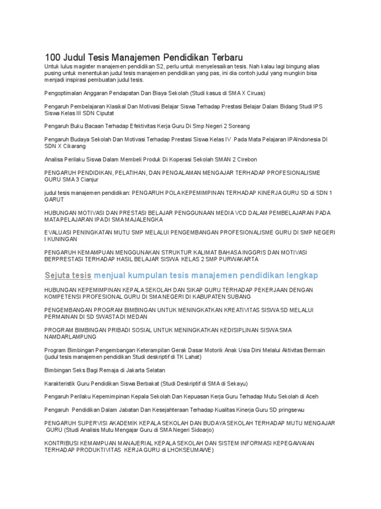 Tersedia berbagai judul untuk tesis manajemen pendidikan sebagai bahan referensi untuk penelitian anda. Ada banyak sekali contoh proposal tesis untuk program manajemen pendidikan yang bisa di download di internet. 8 8 mendukung 1 1 menolak. Simpan simpan contoh tesis manajemen pendidikan untuk nanti. Contoh tesis manajemen pendidikan. Kami juga menyarankan agar anda mendapatkan informasi lainnya yang juga tidak kalah penting yaitu 100 contoh judul skripsi manajemen pemasaran paling menarik 2017 dan juga 150 contoh judul skripsi akuntansi perpajakan s1 terbaru.