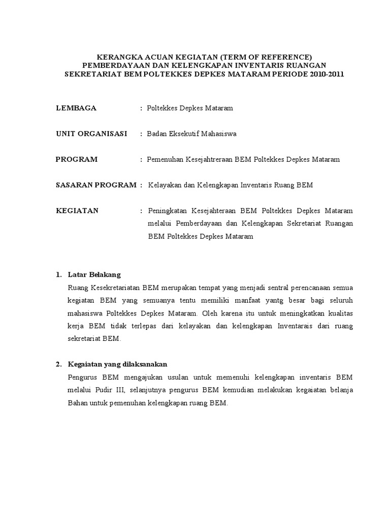 Untuk menunjang proses pembelajaran kader kami mengadakan program pra pelatihan kader dasar pkd dengan tema smart in the world. Kegiatan ini bertema membiasakan berbahasa inggris aktif mahasiswa biologi melalui kegiatan latihan rutin upaya menciptakan guru yang siap menghadapi tantangan zaman. Kerangka acuan kegiatan term of reference seminar kewirausahaan umkm dewan mahasiswa ekonomi islam tahun 2016 kementerian. Oke nggak usah banyak nanya aja kali ya kali ini mau share tentang pembuatan term of reference tor dimana tor ini adalah sebagai alat penjelas undangan bagi siapapun itu baik dari pembicara pemberi sambutan dan tamu undangan yang spesial agar tahu bagiamana sih gambaran acara nya sehingga yang diundang tadi bisa dengan jeli mempersiapkan keperluan yang sekiranya dibutuhkan. 1 persiapan dilakukan dengan menyusun tema kegiatan kerangka acuan kerja jadwal dan penentuan narasumber kegiatan. Pelaksanaan kegiatan serta bahan monitoring dan evaluasi di masa mendatang.