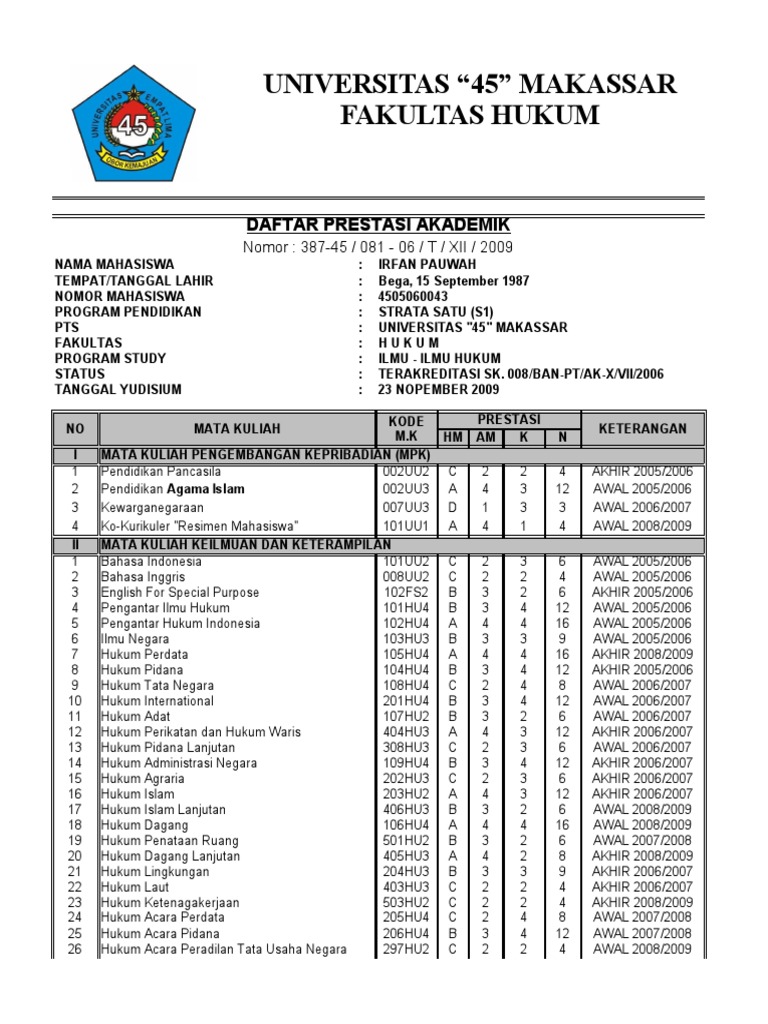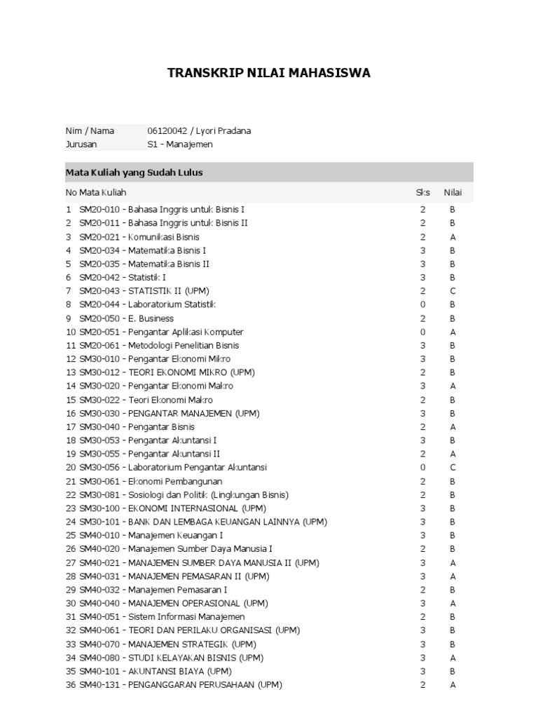 Jika sudah selesai cetak dokumen tersebut. Jika transkrip mu lebih dari 1 halaman pastikan setiap halaman terdapat header siak ng dan nama kamu seperti gambar 1. Transcript nilai berbeda dengan rapor. Dengan ini mrngajukan permohonan surat keterangan nilai mata kuliah berdasarkan studi yang telah saya tempuh dari semester i tahun 20132014 hingga semester iv tahun 20142015sebagai salah satu persyaratan pengajuan beasiswa van deventer maas stiching. Program sarjana pgsd dan pgpaud fkip nilai hasil ujian mahasiswa. Waktu masih semester 3 mata kuliah gengogaku gairon.