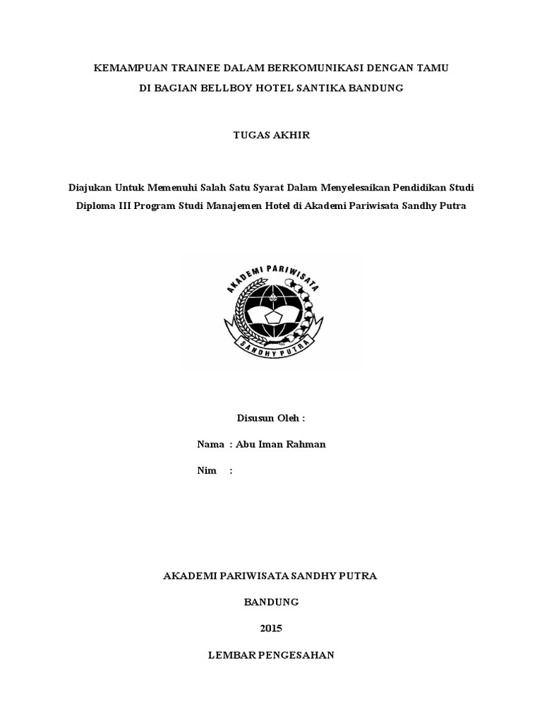 Dalam menyusun karya tulis akhir yang berjudul pentingnya komunikasi bagi sales. Kali ini saya ingin memposting contoh skripsi perhotelan bagi anda yang membutuhkan contoh skripsi perhotelan semoga contoh ini bisa. Yaitu pengumpulan data dengan cara langsung ke lokasi dan mengamati secara langsung obyek yang diteliti sehingga keakuratan data bisa dipertanggung jawabkan peranan cook helper sangat di butuhkan. Pada kesempatan ini kami akan memnerikan contoh skripsi perhotelan dan pariwisata semoga bermanfaatanda juga bisa membaca contoh skripsi ilmu komunikasi atau contoh skripsi komunikasi visualselain itu ada juga contoh skripsi ilmu pemerintahan yang sudah kami berikan pada kesempatan sebelumnya. Itulah yang dapat admin jelaskan terkait contoh laporan tugas akhir d3 perhotelan. Industri perhotelan jilid 1 direktorat pembinaan smk 2013 xi glosarium.