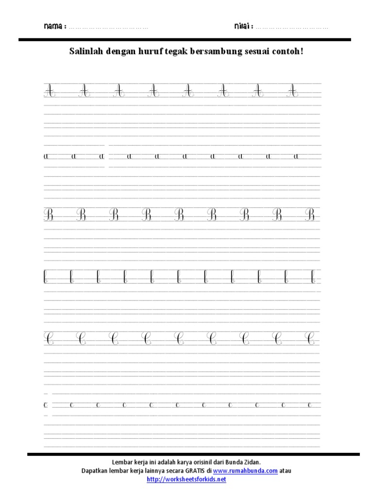 Huruf tegak bersambung ada 2 yaitu cursif dan cursif lignes. Untuk mengenalkan huruf tegak bersambung dapat dilakukan dengan merangkai titik titik yang nantinya apabila disambung akan membentuk abjad huruf tegak bersambung. Lembar kerja ini berisi huruf tegak bersambung putus putus lengkap dengan garis bantu yang bisa dijadikan acuan anak yang baru memulai belajar menulis halus. Langkah awal memperkenalkan siswa dengan semua bentuk huruf abjadnya. Tulisan tegak bersambung contoh tulisan tegak bersambung langkah langkah mengajari menulis adalah. Contoh huruf tegak bersambung 1 contoh huruf tegak bersambung 2 latihan menulis huruf tegak bersambung.