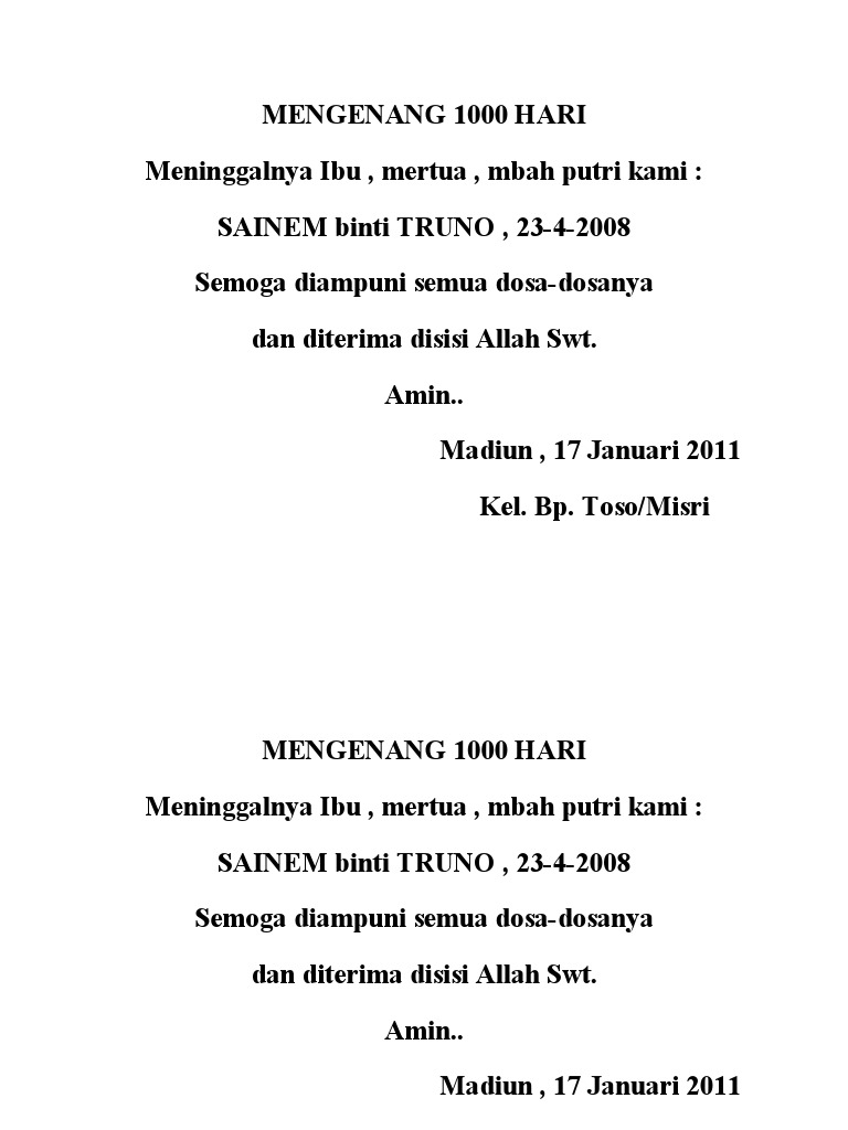 Contoh ucapan 1000 hari orang meninggal word. Contoh surat undangan tahlil digunakan untuk mengundang saudara tetangga sahabat dan kerabat untuk datang ke kediaman kita dalam acara tahlilan. Apa itu acara tahlilan. Tahlilan adalah salah satu bentuk kolaborasi budaya dan agama. Contoh greeting card orang meninggal simak gambar berikut. Inilah rekomendasi tentang contoh ucapan mengenang 1000 hari wafatnya word. Contoh undangan 1000 hari orang meninggal word go words word.