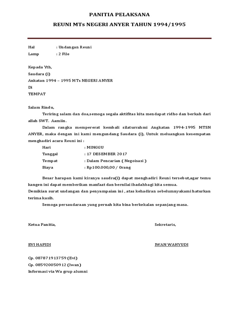Fb twitter wa line pinterest g linkedin. Ulang tahun merupakan sebuah hari kelahiran seseorang yang dimana itu menandakan bahwa hari dimulainya kehidupan seseorang diluar rahim. July 13 2016 at 541 pm reply. Kumpulan contoh undangan reuni akbar sma unik terbaru undangan reuni akbar mei 2015 beriklan di kalender 2019 persaudaraan alumnismakara alumni akabri 95 adakan reuni akbar di cilandak poskota news reuni. Contoh surat undangan reuni reuni merupakan suatu kegiatan yang seringkali dilakukan dengan tujuan mempererat tali silaturahmi. Berikut sebuah contoh tentang undangan reuni gaul.
