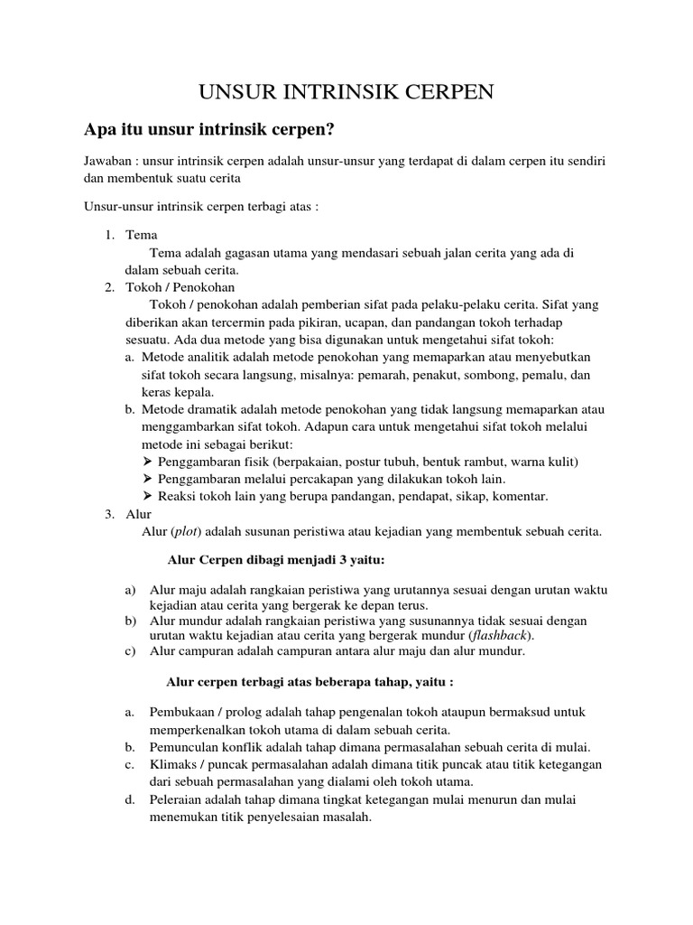 Unsur intrinsik cerpen cerpen cerita pendek merupakan diantara jenis karya sastra yang menggambarkan cerita atau kisah alur hidup manusia dalam bentuk tulisan yang ringkas dan jelas. Unsur intrinsik cerita yang mengatur cara penulis mengekspresikan pemikiran atau gagasan menggunakan bahasa tunggal dan karenanya dapat memberi kesan keindahan bahasa. Contoh cerpen dan unsur intrinsiknya 1. Berikut bentuk unsur intrinsik. Agar lebih jelas silahkan simak contoh unsur intrinsik dalam cerpen berjudul veteran tua berikut ini. Cerpen short story adalah salah satu jenis karya sastra yang isinya mendeskripsikan cerita atau kisah kehidupan manusia dalam bentuk tulisan yang ringkas dan jelas.